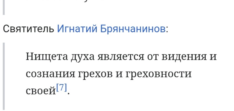 Нет ни одного человека рожденного матерью,кто может считать себя НИЩИМ ДУХОМ,обретшим блаженство,о котором нам говорит Иисус Христос.Истинно свят,которому суждено обрести блаженство лишь ребенок в материнской утробе.Именно к первозданной чистоте ,к тому состоянию НИЩЕТЫ ДУХОМ,которым обладает плод в материнской утробе и призывает нас Спаситель!Мы должны стремиться ни к НИЩИТЕ ДУХОМ какого либо святого человека,а к ИСТОЧНИКУ НИЩЕТЫ ДУХОМ,то есть стремиться заново ,даже не родиться,а зародиться.